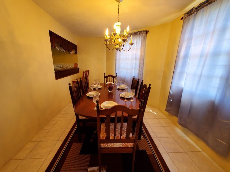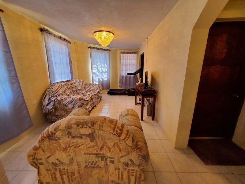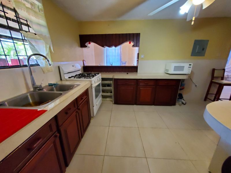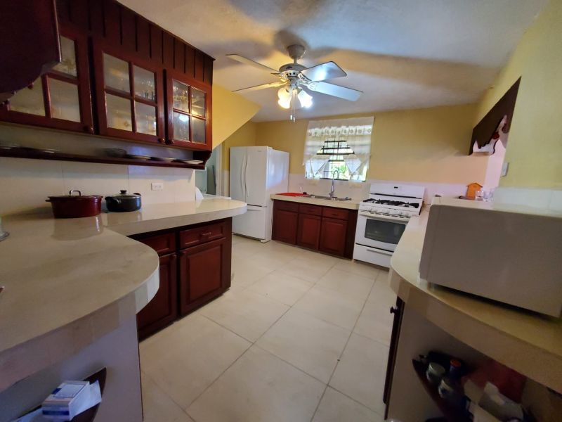 On the main level, you’ll find a spacious kitchen with a breakfast bar, ample counter space, and plenty of storage. This floor also includes the living and dining areas, a convenient laundry room, a powder room, a storeroom, and one of the four bedrooms. Step outside to the covered rear patio, which overlooks a lush garden filled with mature fruit trees, including soursop and banana.
