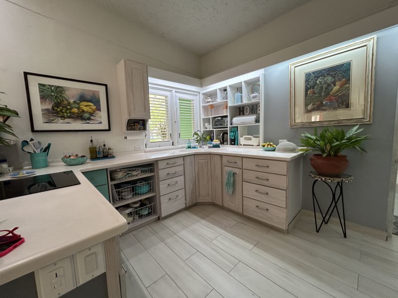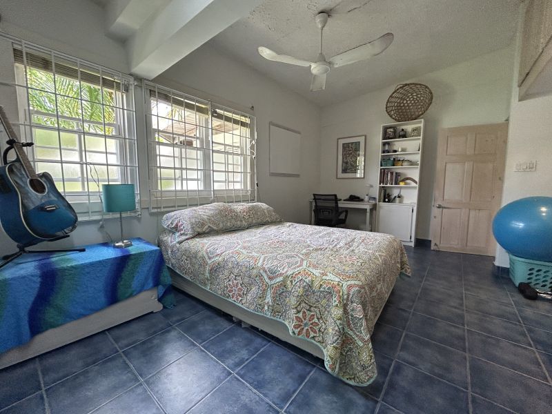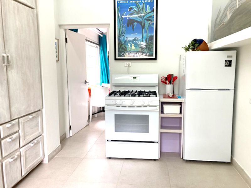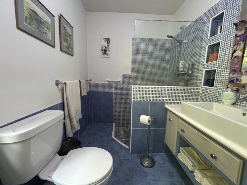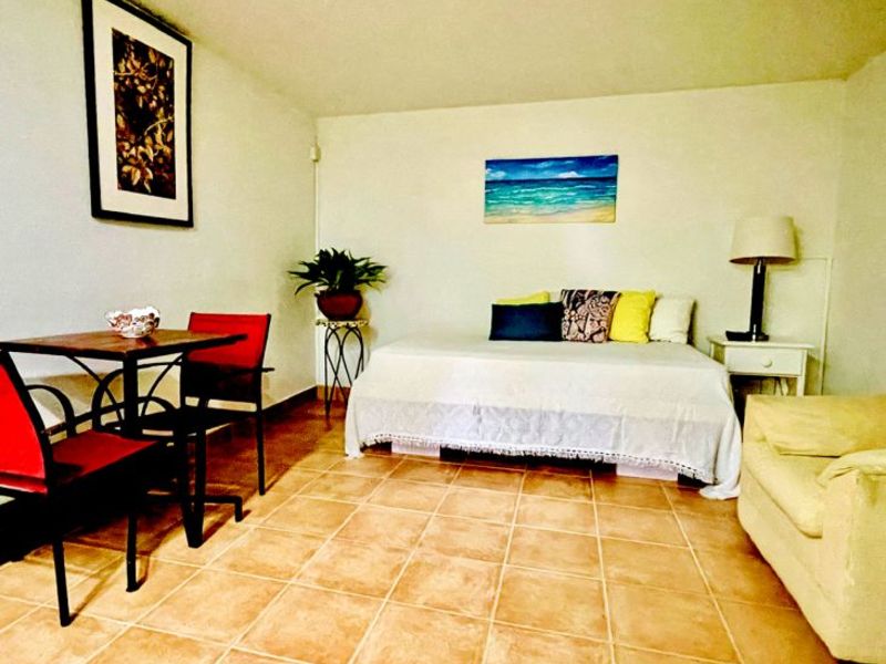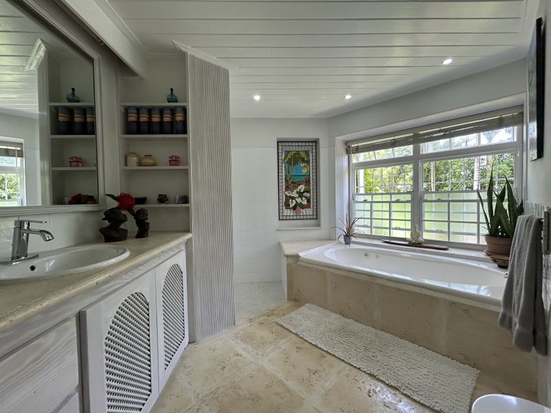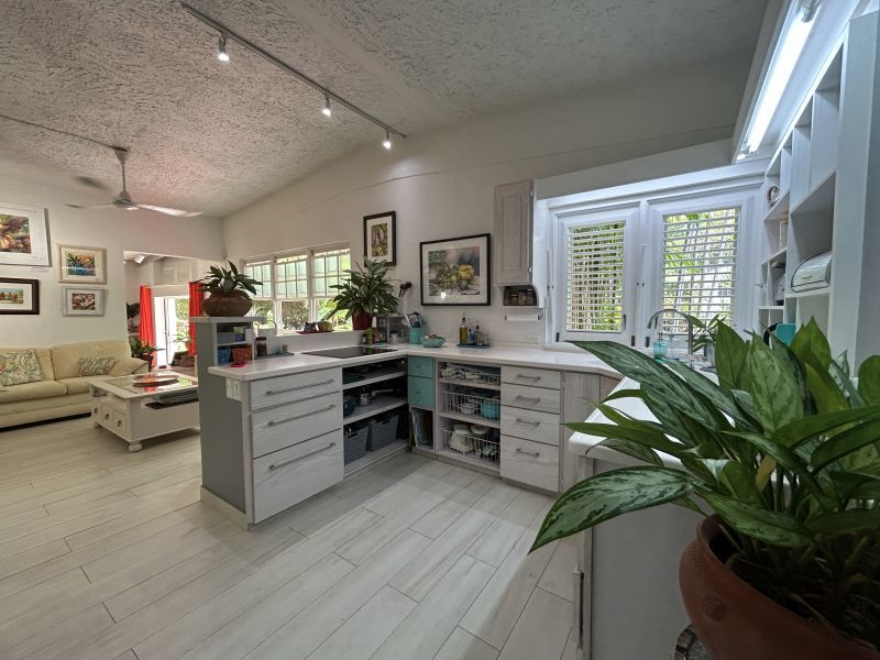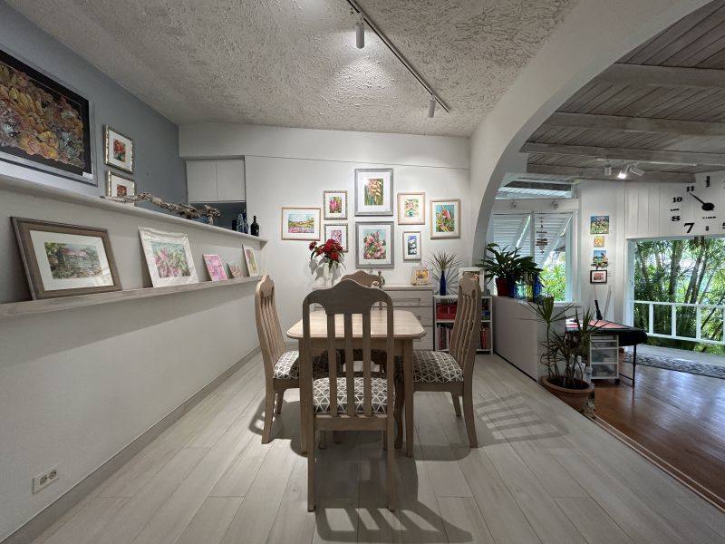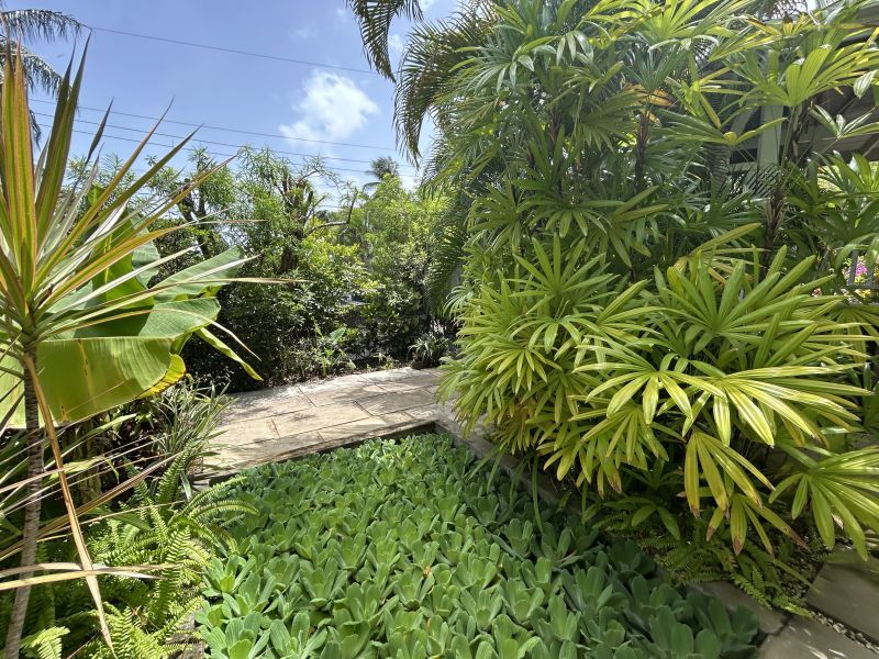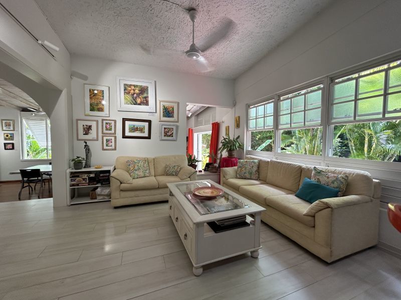 The Main House, offering 1560 sq ft of elegantly casual living, features warm pine floors and a high pickled pine ceiling that evoke an airy sophistication. Tall white push-out windows frame picturesque garden views, while a striking 9-foot glass pocket sliding door seamlessly connects the main living area to an open-air patio shaded by tall bamboo and majestic palms. This immersive design blurs the lines between indoor and outdoor, extending your living space into the vibrant surroundings. Three steps up, an open-plan dining room, a cozy secondary living space, and a recently refurbished kitchen await. Two spacious ensuite bedrooms ensure privacy and comfort, further enhanced by a convenient powder room and large utility room.