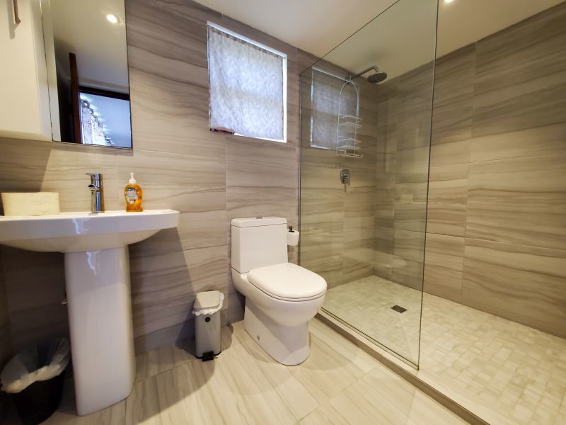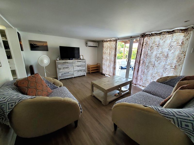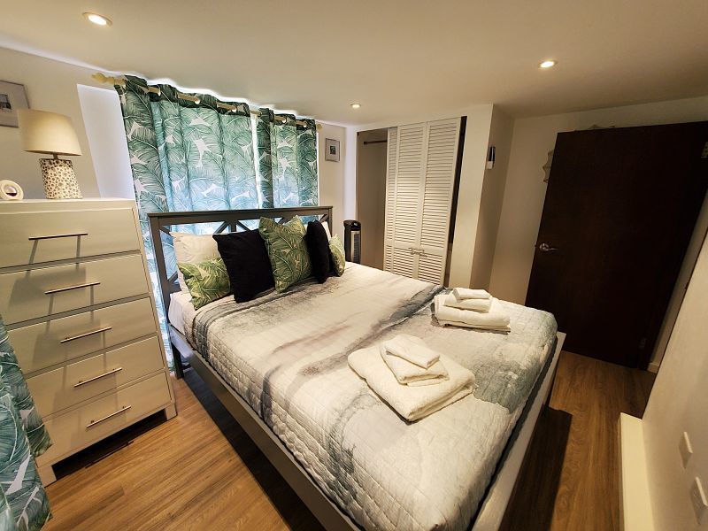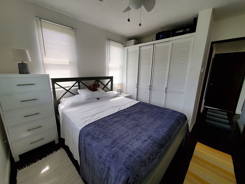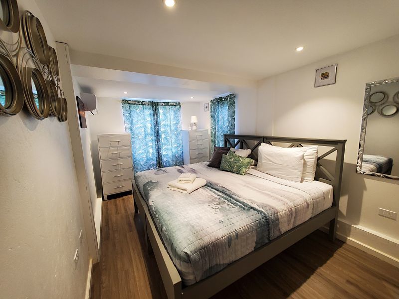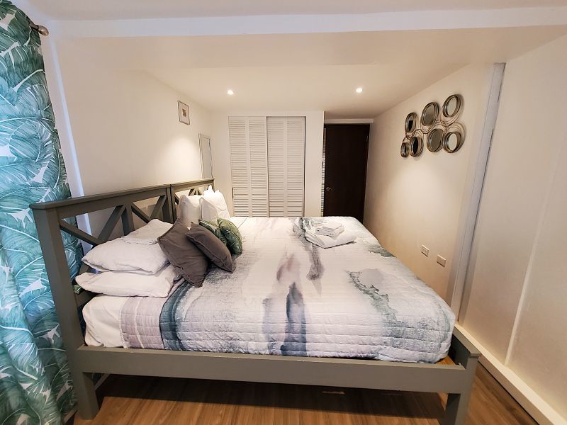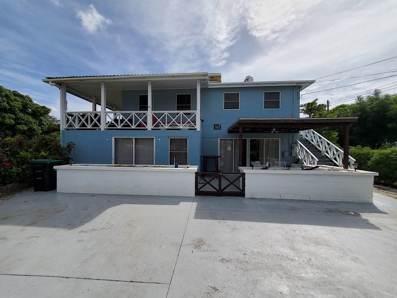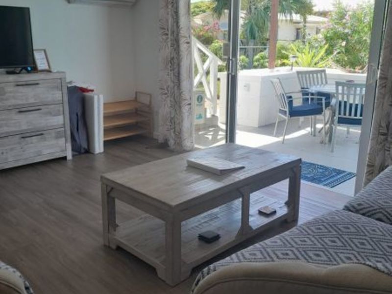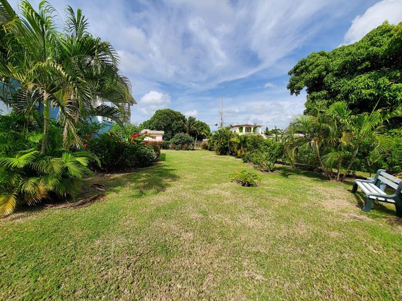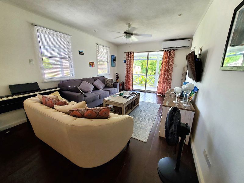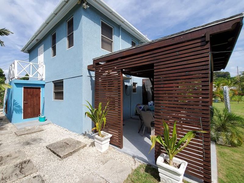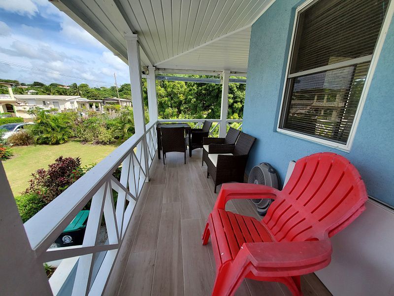 The upstairs apartment features two bedrooms and one modern bathroom. A standout feature is the expansive L-shaped patio, providing an elevated space to enjoy the tropical breezes and views over the stunning gardens.