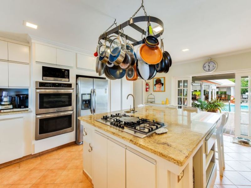 On the ground floor is a TV room and kitchen. There is also a formal dining room. This opens onto a covered deck which has a covered outdoor living room. There is a bar here. It is the perfect spot to relax and entertain. A wonderful place to watch the sun set. Also great for hosting parties.
